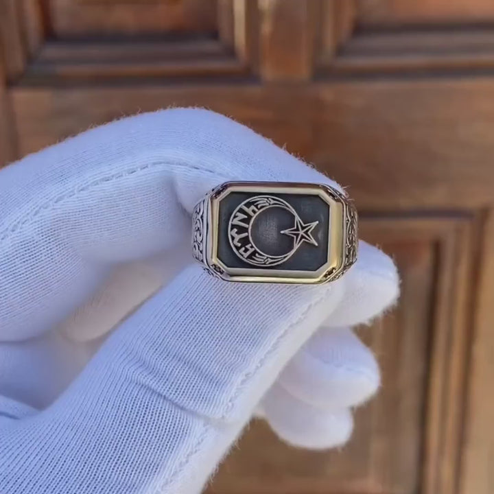 خاتم رجالي من فضة 925 بنقش النجمة والهلال، تصميم عصري وأنيق يضفي لمسة فريدة لإطلالتك. هدية رائعة لكل رجل مميز.