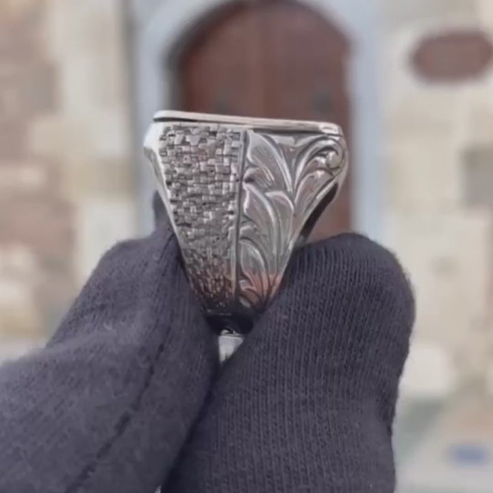 خاتم رجالي من فضة 925 بنقش النسر مع الهلال والنجمة، تصميم قوي وفخم يبرز الذوق الرفيع. هدية رائعة لكل مناسبة.