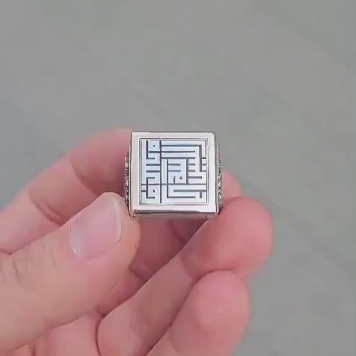 خاتم فضة 925 رجالي بنقش بالخط الكوفي "أليس الله بكافٍ عبده"، تصميم فني أنيق يبرز الذوق الرفيع. هدية مثالية لكل رجل.
