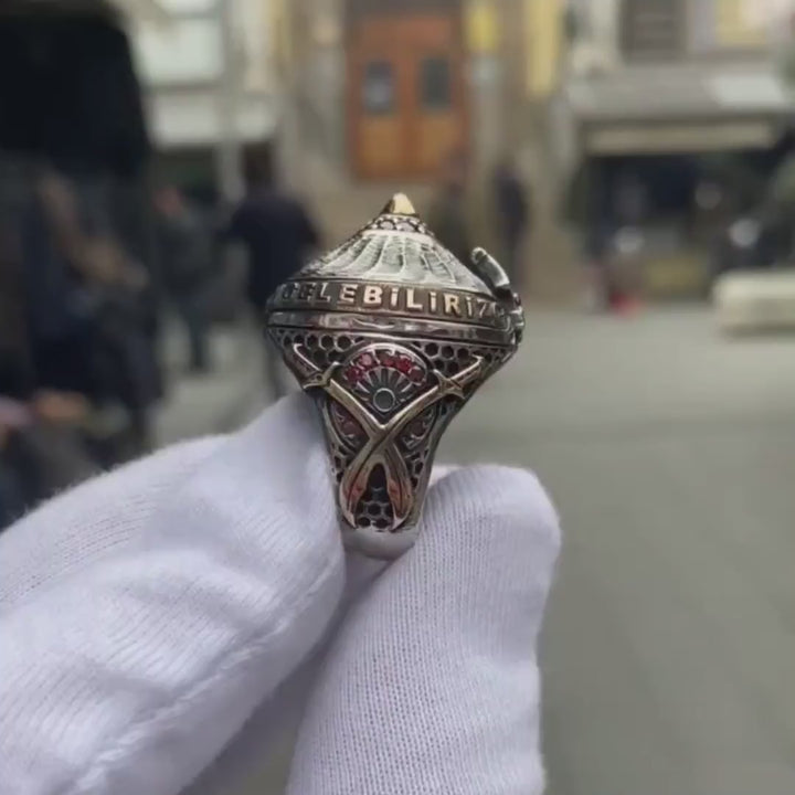 خاتم رجالي من فضة 925 مستوحى من خوذة الفتح، تصميم مهيب وفاخر يجمع بين القوة والفخامة. هدية فريدة ومميزة.