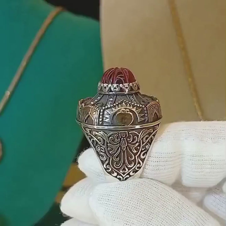 خاتم فضة 925 رجالي اسلامي مرصع بحجر العنبر على شكل قبة، تصميم فريد وأنيق يجمع بين التراث والفخامة. هدية مميزة لكل رجل.