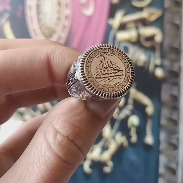 خاتم رجالي من فضة 925 بنقش "حسبي الله" دائري، تصميم أنيق يجمع بين الأصالة والفخامة العصرية. هدية مثالية لكل رجل.
