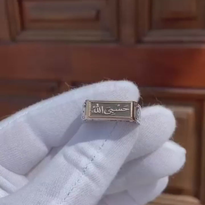 خاتم فضة 925 رجالي بنقش "حسبي الله"، تصميم اسلامي فاخر يعكس البساطة والفخامة في نفس الوقت. هدية رائعة لكل رجل.