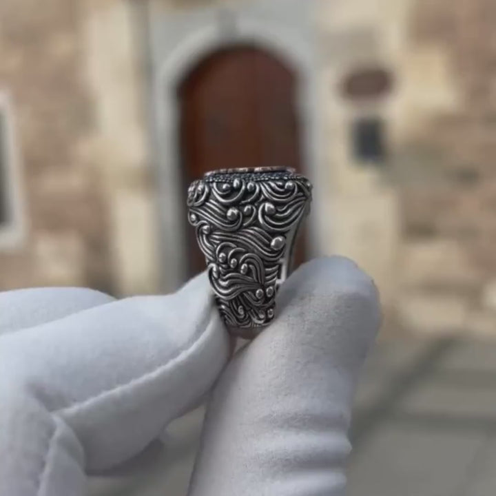 خاتم فضة رجالي 925 بتصميم أنيق ومزين بالمرساة والدفة البحرية المنقوشة بدقة، يزينه أحجار زرقاء داكنة صغيرة تضيف لمسة فخمة وأناقة راقية، تصميم يجمع بين البساطة والجاذبية ليمنحك مظهرًا مميزًا في كل مناسبة.
