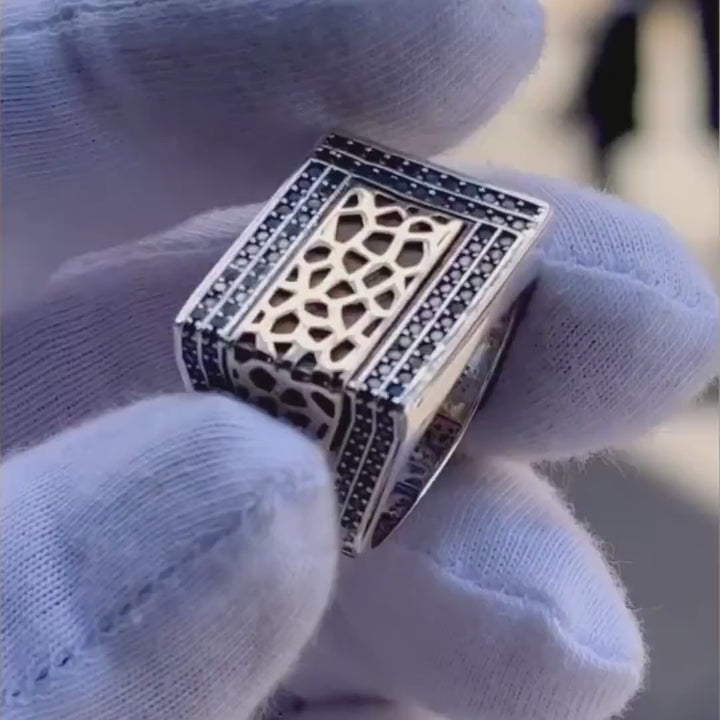 خاتم فضة رجالي 925 مرصع بحجر العقيق مزين بتصميم قطع كسر الزجاج العصري