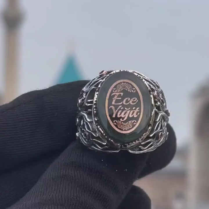 خاتم فضة رجالي 925 مرصع بحجر الكهرمان الطبيعي مزين بإطار فاخر