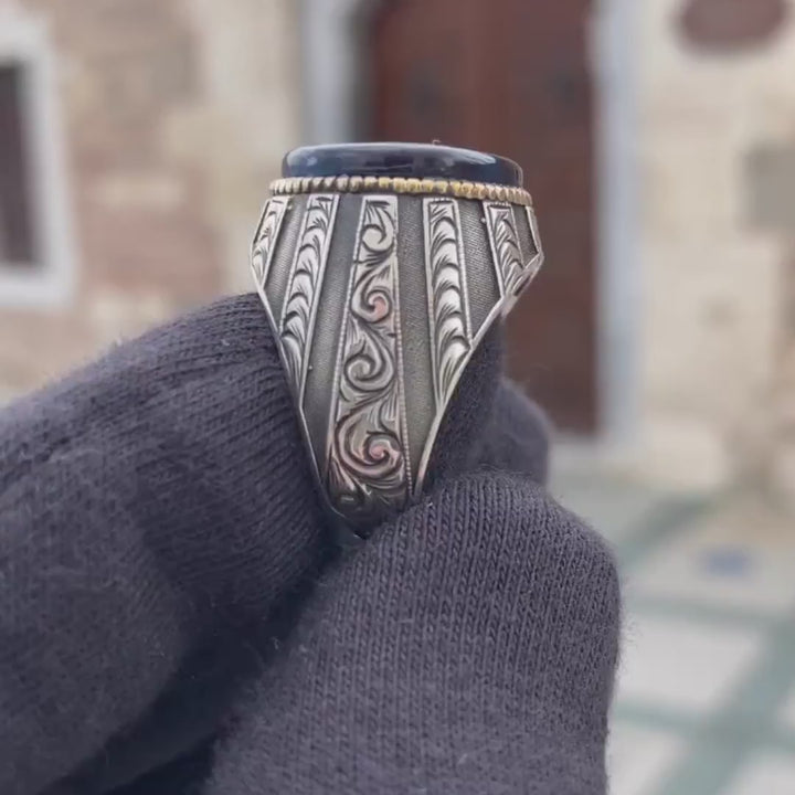 خاتم فضة 925 عالية الجودة، مصمم بشكل بيضاوي ومزين بحجر كهرمان أزرق داكن طبيعي يمنح إطلالة راقية. إمكانية تخصيص التصميم بإضافة شعار أو حروف أو نقوش شخصية. يحيط بالخاتم خطوط فنية محفورة يدويًا تضفي عليه طابعًا فريدًا وأناقة. مما يجعله خيارًا مثاليًا لهدية راقية تعبّر عن الأصالة والذوق الرفيع.