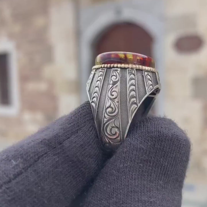 خاتم فضة 925 عالية الجودة بتصميم بيضاوي أنيق مرصع بحجر كهرمان مزدوج اللون (عسلي وكهرماني داكن) يمنح توازنًا بصريًا؛ يتوسط الخاتم حرف محفور بإتقان يعبر عن الهوية الشخصية ويمنحه طابعًا فريدًا. النقوش الجانبية المحفورة بأسلوب تضيف إليه لمسة من الفخامة والحرفية اليدوية العالية. خيار مثالي لمن يبحث عن الأناقة مع لمسة شخصية تعبّر عن الذات والتميز.