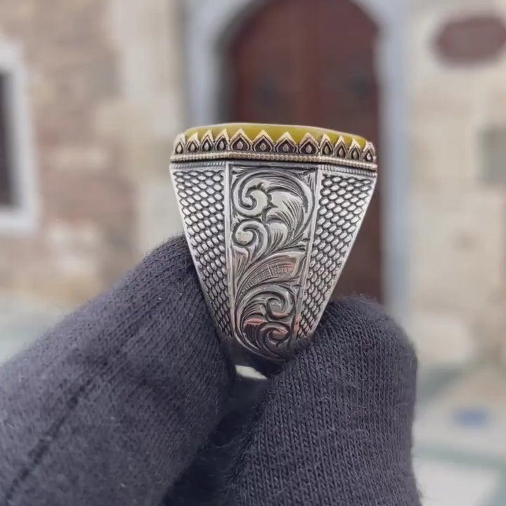 خاتم فضة 925 بتصميم مثمّن الشكل مزين بحجر كهرمان أصفر طبيعي يضفي لمسة من الدفء والفخامة، يتوسطه حرف محفور بإتقان يعبر عن التفرد والهوية الشخصية. تبرز النقوش الدقيقة على جانبي الخاتم جمال الحرفية اليدوية وتكمل التصميم الكلاسيكي المتناغم مع بريق الفضة. قطعة مثالية تجمع بين البساطة والتميّز وتصلح كهدية راقية تعبّر عن الذوق الرفيع.