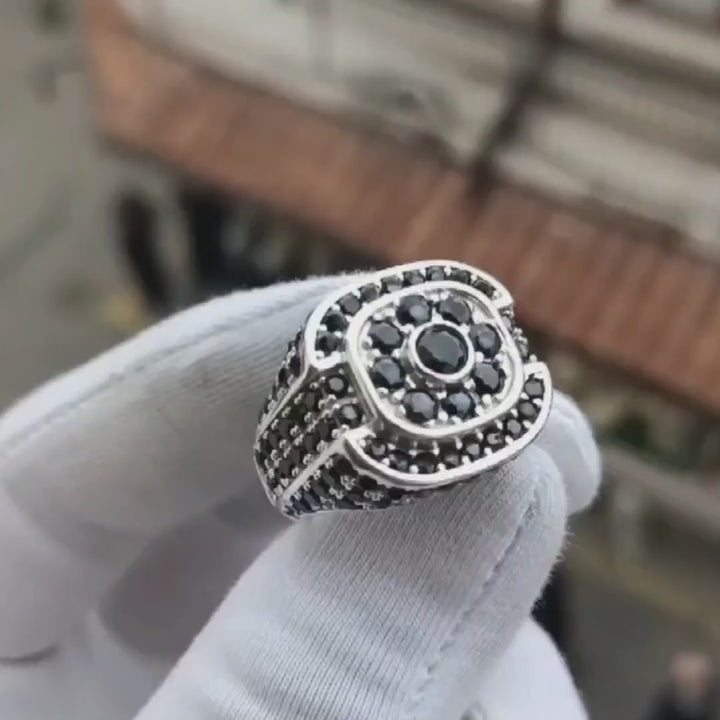 خاتم فضة رجالي 925 رجالي تصميم فاخر مرصع بحجر زركون أزرق داكن على الجزء العلوي والجانبي، أحجام مختلفة من الزركون تضيف عمقًا وأناقة، تصميم عصري وراقٍ يجذب الأنظار، مناسب كهدية مميزة أو لتكريم المناسبات الخاصة.