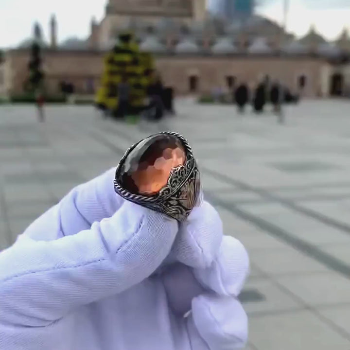 خاتم فضة رجالي 925 مرصع بحجر الزولتانيت مع إطار منقوش يدوياً